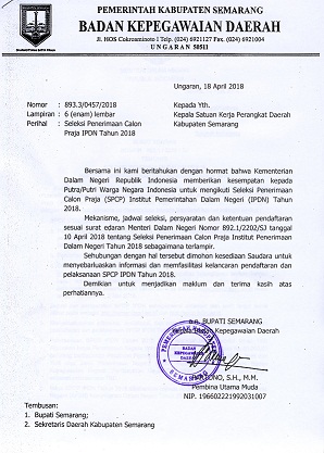 Ungaran (18/04/2018)-Admin BKD, Kementerian Dalam Negeri Republik Indonesia memberikan kesempatan kepada Putra / Putri Warga Negara Indonesia untuk mengikuti Seleksi Penerimaan Calon Praja (SPCP) Institut Pemerintahan Dalam Negeri (IPDN) Tahun 2018. Pengumuman selengkapnya dapat di download pada surat di bawah ini: