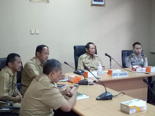 Bupati Semarang didampingi oleh Kepala BKD, Kasubbag Rendiklat Pusdikmin dan beberapa Narasumber Perangkat Daerah dalam melaksanakan Video Conference