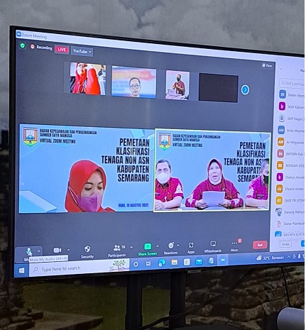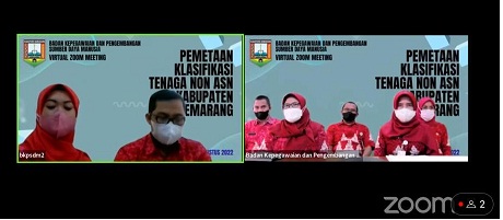 Ungaran (10/08/2022)-Admin BKPSDM, Menindak lanjuti Surat Edaran Menteri PANRB Nomor B/1511/M.SM.01.00/2022 tentang Pendataan Tenaga Non ASN di Lingkungan Instansi Pemerintah, maka Pemerintah Kabupaten Semarang melalui BKPSDM Kabupaten Semarang menyelenggarakan acara Pemetaan Klasifikasi Tenaga Non ASN di Lingkungan Pemerintah Kabupaten Semarang yang dilaksanakan secara daring melalui Zoom Meeting pada siang ini Rabu (10/08/2022). Peserta zoom merupakan pengelola kepegawaian pada 46 SKPD hingga unit terkecil pada SMP dan Korwil BidDik Dinas Pendidikan hingga Puskesmas. Zoom dibagi dalam 2 sesi, sesi pertama diikuti 72 unit kerja hingga UPTD Kesehatan dan sesi kedua diikuti  72 unit kerja pada Dinas Pendidikan. Tujuan dari pelaksanaan kegiatan ini adalah untuk melakukan pemetaan dan mengetahui jumlah Pegawai Non-ASN di Kabupaten Semarang.