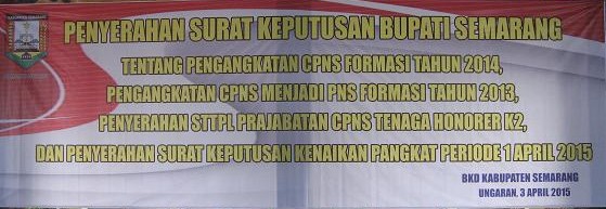 Ungaran (13/04/2015)-Admin BKD, Pada hari Jum'at tanggal 03 April 2015 bertempat di Rumah Dinas Bupati Semarang telah berlangsung acara "Penyerahan Surat Keputusan Bupati Semarang, tentang Pengangkatan CPNS Formasi Tahun 2014, Pengangkatan CPNS Menjadi PNS Formasi Tahun 2013, Penyerahan STTPL Prajabatan CPNS Tenaga Honorer K2, dan Penyerahan Surat Keputusan Kenaikan Pangkat Periode 1 April 2015".
