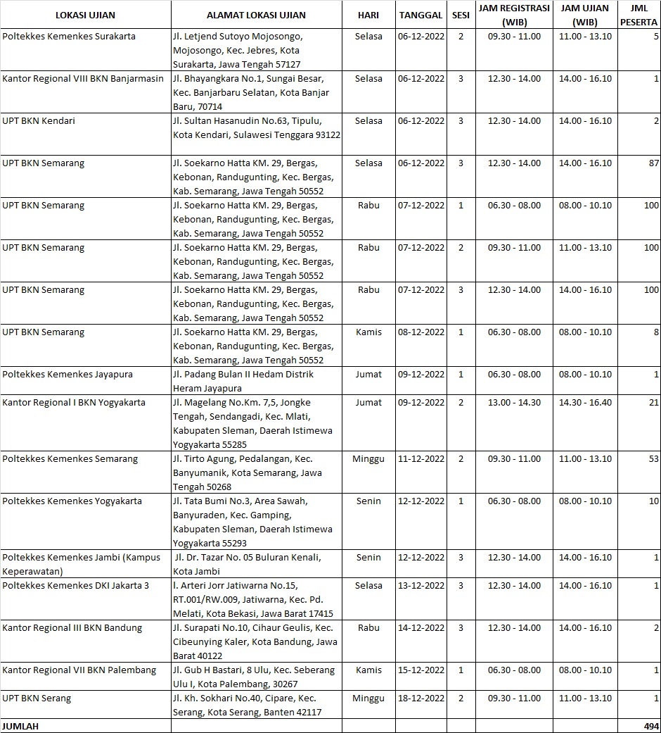 Pengumuman jadwal dan tata tertib secara lengkap akan ditayangkan besok Senin, 5 Desember 2022 melalui website BKPSDM Kabupaten Semarang. Peserta agar selalu memantau informasi di website BKPSDM Kabupaten Semarang. Hal-hal yang harus dipersiapkan : mencetak kartu ujian di akun SSCASN (cetak berwarna bukan hitam putih) dan ditandatangani, membawa KTP Asli yang masih berlaku, mencetak sertifikat vaksin minimal sampai dosis ke-2 (cetak berwarna bukan hitam putih), membawa Deklarasi Sehat yang diisi dan dicetak dari akun SSCASN, menginstal aplikasi Peduli Lindungi di HP, tiba di lokasi ujian maksimal 30 menit sebelum jam registrasi, memakai pakaian formal atas kemeja putih polos lengan panjang,  bawah celana/rok hitam polos panjang semata kaki, sepatu hitam polos formal, jilbab hitam polos (bagi wanita yang berjilbab), memakai masker 3 lapis (3 ply) berwarna putih, membawa pensil kayu. Lokasi ujian adalah sesuai yang dipilih peserta pada saat pendaftaran. Bagi peserta seleksi yang terkonfirmasi positif Covid-19 dapat menyampaikan bukti surat rekomendasi dokter dan/atau hasil swab PCR dan keterangan menjalani isolasi dari dokter melalui email  This email address is being protected from spambots. You need JavaScript enabled to view it.   paling lambat H-1 pelaksanaan ujian.