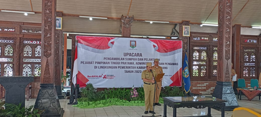 Ungaran, (05/09/2023) Admin BKPSDM, Sejumlah 123 pejabat struktural dilantik Bupati Semarang, terdiri dari 2 Pejabat Pimpinan Tinggi Pratama (Eselon II B), 56 Pejabat Administrator (14 Eselon III A dan 42 Eselon III B), 65 Pejabat Pengawas ( 58 Eselon IV A dan 7 Eselon IV B) bertempat di Pendopo Rumah Dinas Bupati Semarang Senin siang (05/09/2023). Hadir pula dalam acara tersebut Wakil Bupati Semarang, Forkopimda Kabupaten Semarang, Kepala Dispermades Dukcapil Provinsi Jawa Tengah, Sekretaris Daerah Kabupaten Semarang, Para Staf Ahli Bupati Semarang, Para Asisten Sekretaris Daerah Kabupaten Semarang, Para Kepala Perangkat Daerah Kabupaten Semarang, dan Ketua Tim Penggerak PKK Kabupaten Semarang.