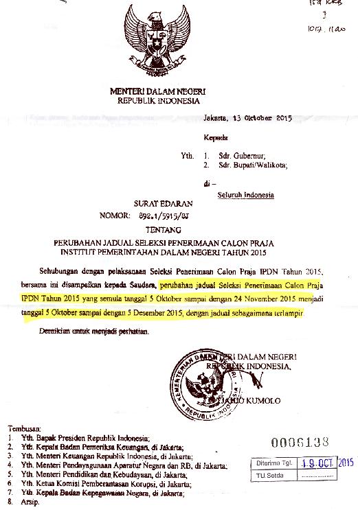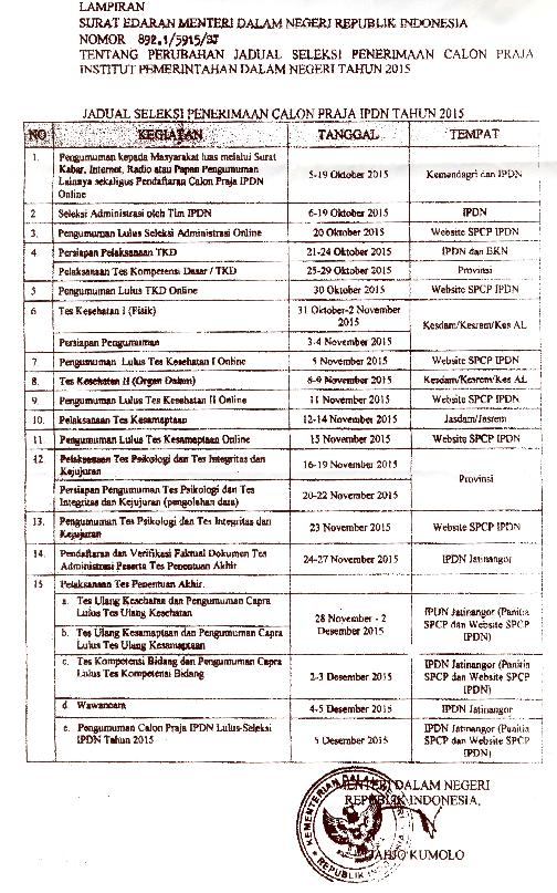 PERUBAHAN JADWAL SELEKSI PENERIMAAN CALON PRAJA IPDN TAHUN 2015