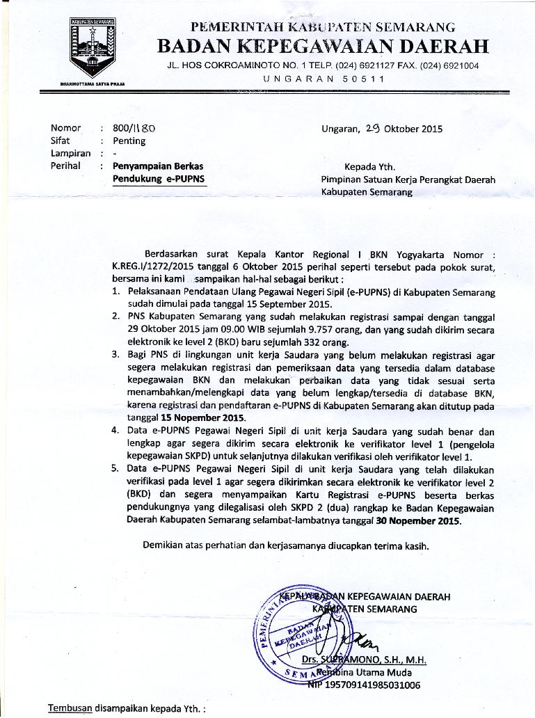 Berdasarkan surat Kepala Kantor Regional I BKN Yogyakarta Nomor :K.REG.I/1272/2015 tanggal 06 Oktober 2015 Perihal Penyampaian Berkas Pendukung e-PUPNS ,maka Registrasi dan pendaftaran e-PUPNS di Kabupaten Semarang akan ditutup pada tanggal 15 Nopember 2015. Data e-PUPNS yang sudah benar dan lengkap agar segera dikirim secara elektronik ke verifikator level 1 (pengelolaan kepegawaian SKPD)  untuk dilakukan verifikasi.  Kemudian, oleh verifikator level 1 data yang sudah terverifikasi tersebut di kirim secara elektronik ke verifikator level  2 (BKD) dan segera menyampaikan  Kartu Registrasi e-PUPNS beserta berkas pendukungnya yang dilegalisasi oleh SKPD 2 (dua) rangkap ke BKD Kabupaten Semarang selambat-lambatnya tanggal 30 Nopember 2015.