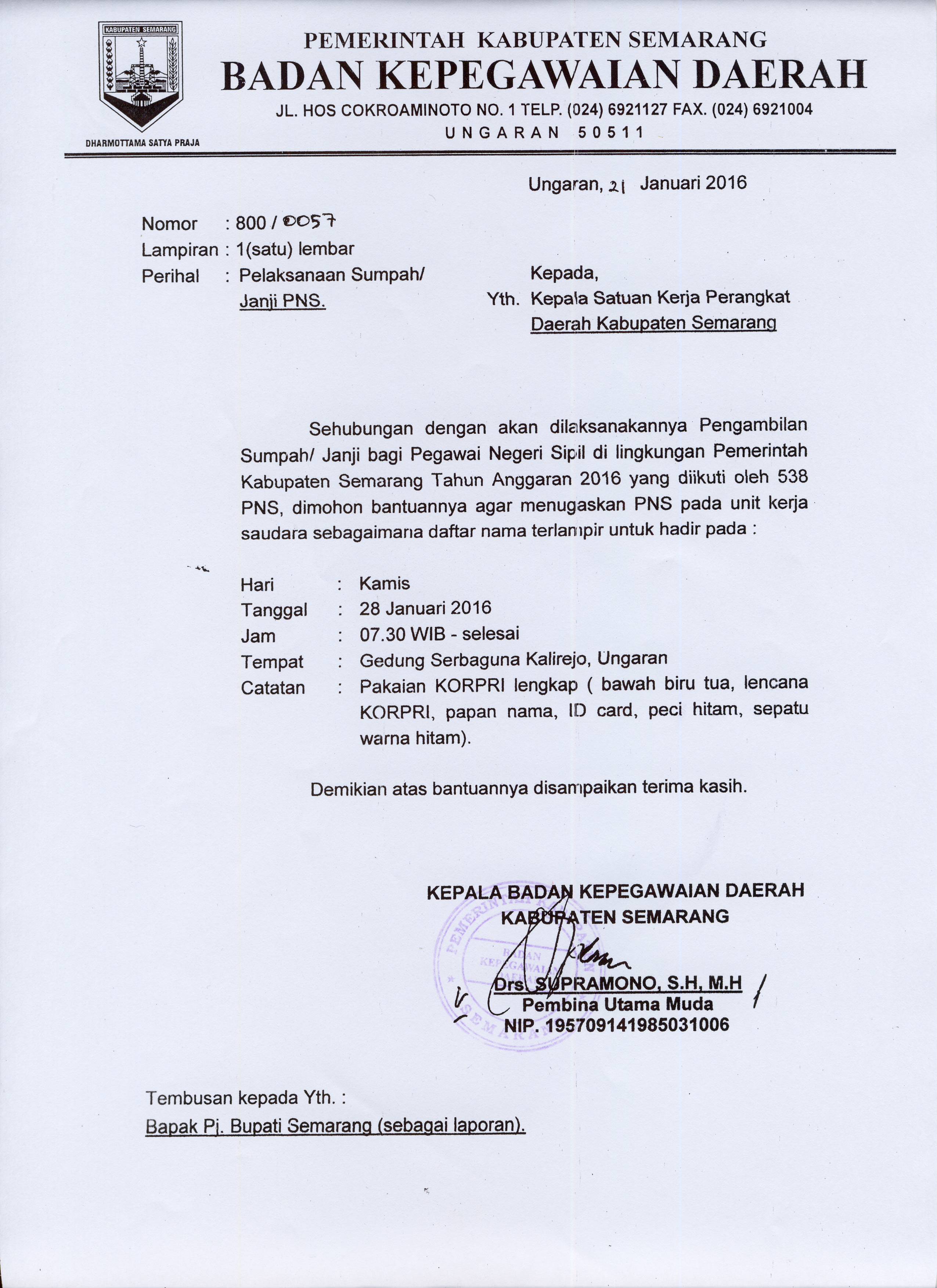 Ungaran (25-01-2016)- Admin BKD, Berdasarkan surat Kepala Badan Kepegawaian Daerah Kab. Semarang nomor 800 / 0057 perihal Pelaksanaan Sumpah Janji PNS Kab. Semarang. Adapun daftar PNS sebagai mana terlampir pada link dibawah ini.