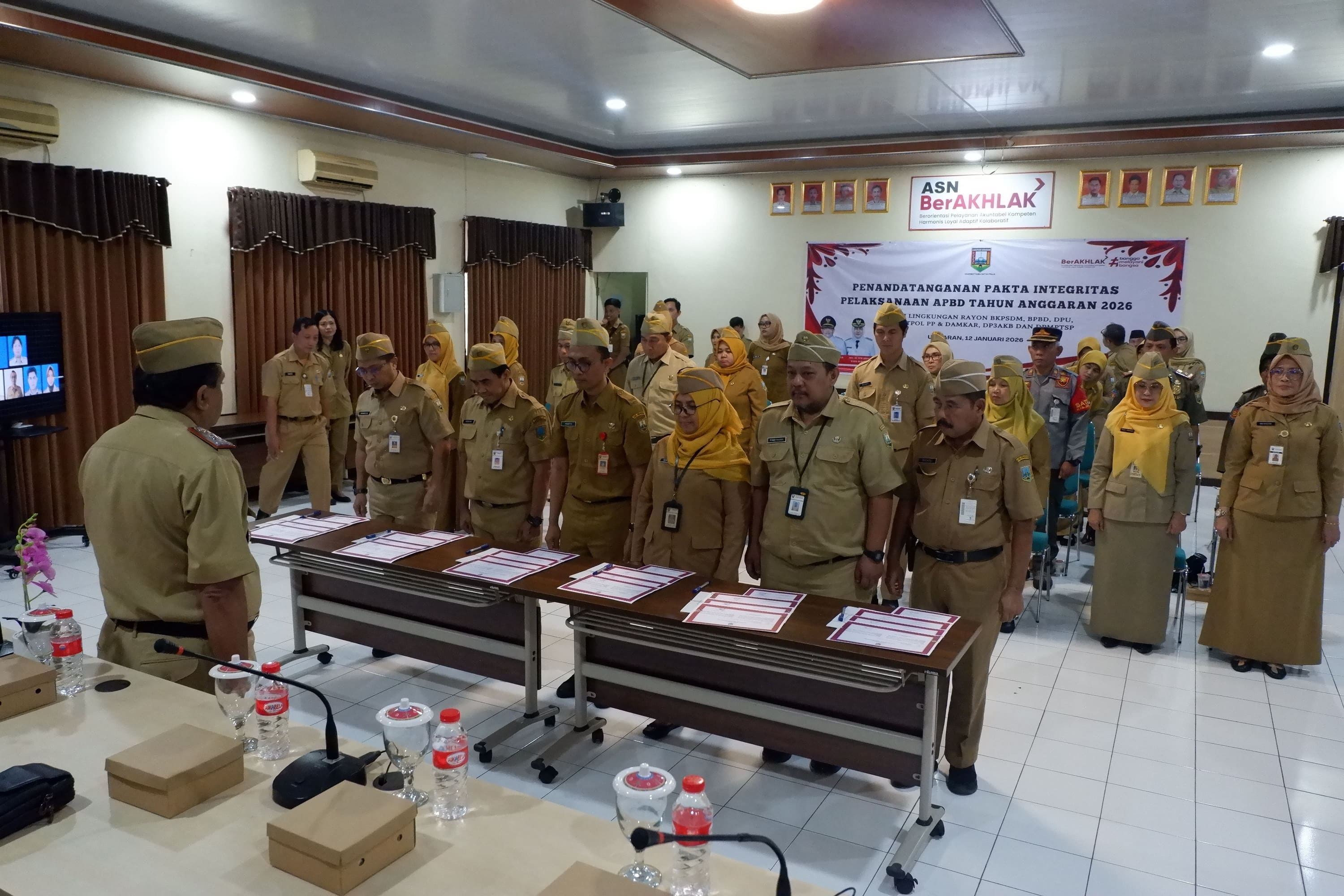 Dalam sambutannya Bupati Semarang yang dibacakan Sekretaris Daerah Valeanto Soekendro menyampaikan apresiasi dan memberikan penghargaan setinggi-tingginya kepada pejabat administrator di lingkungan BKPSDM, BPBD, Satpol PP dan Damkar, DPU, DP3AKB, dan DPMPTSP atas komitmennya untuk mewujudkan dan melaksanakan optimalisasi pembangunan di perangkat daerah masing-masing. Penandatanganan pakta integritas ini merupakan wujud komitmen bersama dalam memastikan pelaksanaan APBD Kabupaten Semarang tahun anggaran 2026 agar berjalan transparan, akuntabel, dan sesuai ketentuan peraturan perundang-undangan, dan merupakan amanah yang harus dikelola secara bertanggung jawab, tepat sasaran, dan berorientasi pada kepentingan masyarakat. Sementara itu perjanjian kinerja menjadi instrumen penting untuk memperjelas target, indikator, dan pertanggungjawaban kinerja masing-masing perangkat daerah dan pejabat yang menandatanganinya, setiap program dan kegiatan yang dilaksanakan memiliki arah yang jelas, terukur, serta dapat dipertanggungjawabkan hasilnya. Oleh karena itu integritas, kedisiplinan, dan profesionalisme aparatur menjadi kunci utama dalam mewujudkan pengelolaan keuangan daerah yang tertib, efektif, dan dapat dipertanggungjawabkan.