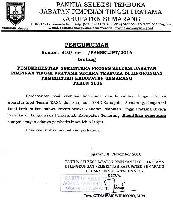 Ungaran (18/11/2016) - Admin BKDBerdasarkan hasil evaluasi, koordinasi dan konsultasi dengan Komisi Aparatur Sipil Negara (KASN) dan Pimpinan DPRD Kabupaten Semarang, dengan ini kami beritahukan bahwa Proses Seleksi Jabatan Pimpinan Tinggi Pratama Secara Terbuka di Lingkungan Pemerintah Kabupaten Semarang DIHENTIKAN SEMENTARA sampai dengan adanya pemberitahuan lebih lanjut.
