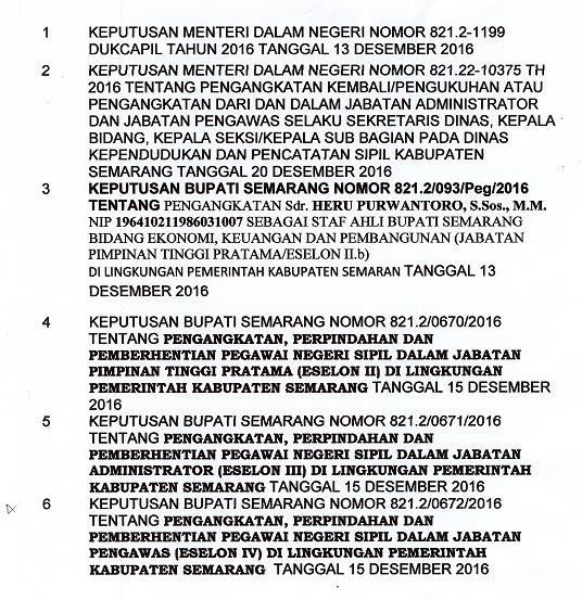 Ungaran (03/01/2017)-Admin BKD, Bertempat di Pendopo Rumah Dinas Bupati Semarang pada hari sabtu 30 desember 2016 dilaksanakan acara "Pelantikan, Pengukuhan dan Pengambilan Sumpah Pejabat Pimpinan Tinggi Pratama, Administrator dan Pengawas di Lingkungan Pemerintah Kabupaten Semarang Tahun 2016". Bupati Semarang, Dr. H. Mundjirin ES, SpOG melantik sebanyak 646 PNS di Lingkungan Pemerintah Kabupaten Semarang untuk menduduki posisi strategis tersebut, 120 PNS diantaranya adalah staf yang mendapatkan promosi sebagai pejabat struktural.