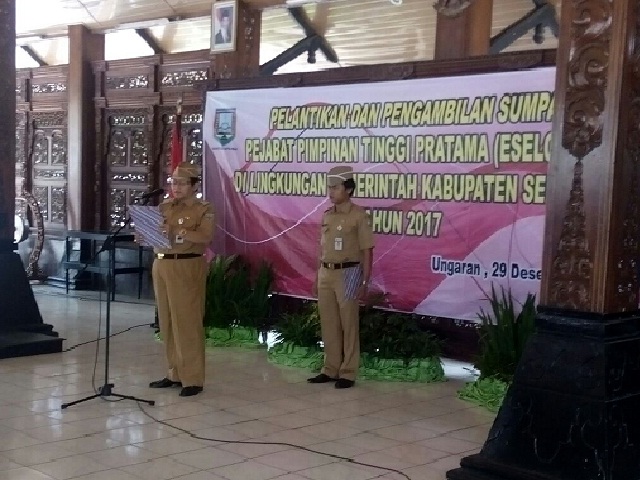 Ungaran (29/12/2017)-Admin BKD, Bertempat di Pendopo Rumah Dinas Bupati pada hari ini, jumat (29/12/2017) telah berlangsung acara Pelantikan dan Pengambilan Sumpah Pejabat Pimpinan Tinggi Pratama di Lingkungan Pemerintah Kabupaten Semarang. Acara yg dipimpin langsung oleh Bupati Semarang tersebut melantik 5 orang Pejabat Struktural Eselon II.b