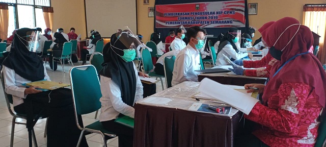 Ungaran (13/11/2020)-Admin BKD, Bertempat di Aula BKD Kabupaten Semarang, panitia seleksi CPNS formasi tahun 2019 mengundang 495 orang peserta yang lolos seleksi untuk melaksanakan  pemberkasan file fisik pengusulan NIP CPNS. Dari 495 orang peserta lulus seleksi tersebut 2 orang menyatakan mengundurkan diri dan telah diganti oleh 2 orang peserta dengan peringkat hasil ujian dibawahnya, mereka dijadwalkanan akan melaksanakan pemberkasan fisik minggu depan. Pemberkasan seyogyanya dilaksanakan secara online pada portal recruitment BKN, namun melihat banyaknya permasalahan yang dialami CPNS pada Pemerintah Kabupaten Semarang dalam hal kekawatiran kesalahan dokumen yang diunggah maka panitia berinisiatif untuk membantu verifikasi dokumen yang akan diunggah tersebut. Pemberkasan fisik yang dilaksanakan selama 3 hari sejak tanggal 11 s.d 13 november 2020 berjalan lancar dengan tetap mematuhi protokol kesehatan yang berlaku.