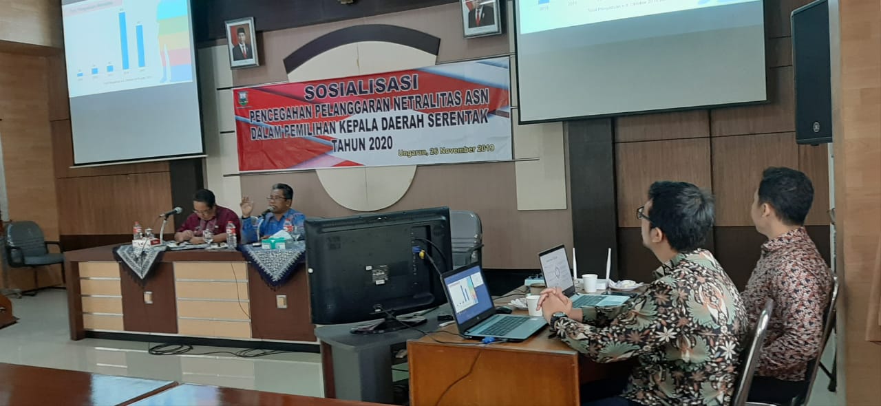 Ungaran (26/11/2019-Admin BKD)-Bertempat di Gedung Dharma Satya SETDA Kabupaten Semarang hari ini telah berlangsung acara Sosialisasi Netralitas ASN. Sesuai amanat PP No.42 Tahun 2004 tentang Pembinaan Jiwa Korps dan Kode Etik PNS yakni Pasal 11 huruf c bahwa, "Dalam kode etika terhadap diri sendiri pns wajib menghindari konflik kepentingan pribadi, kelompok atau golongan maka pns dilarang melakukan perbuatan yang mengarah pada keperpihakan salah satu calon atau perbuatan yang mengindikasikan terlibat dalam politik praktis / berafiliasi dengan partai politik"